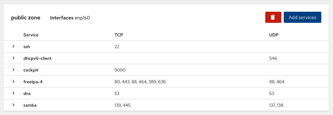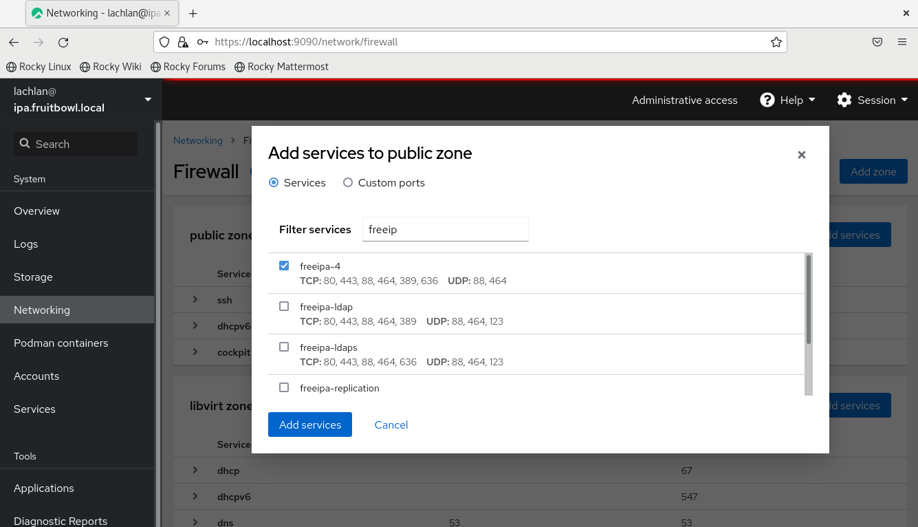 From within cockpit, I'm just going to navigate to Networking -> Edit Rules/Zones -> Add services (public zone) and search and tick both freeipa-4, samba and dns.