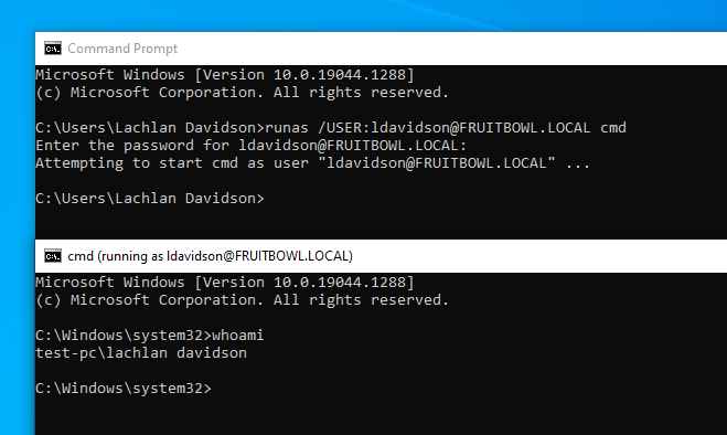We can confirm our Kerberos authentication and user mapping has worked by trying to spawn a shell as our FreeIPA user: runas /USER:ldavidson@FRUITBOWL.LOCAL cmd.